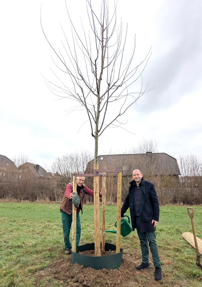 Die Schirmherrin der Initiative „3333 Bäume für Krefeld“, Renate Krins, bedankte sich bei der Firma PRECOPLAT für die großzügige Spende. Die Spende komme nicht nur Mensch, Natur und Klima zugute, sondern diene auch der Erweiterung des Baumbestandes auf der Fläche der Bäume des Jahres, die die Stadt Krefeld in Krefeld-Hüls angelegt hat und auf der der Baum des Jahres 2026 gepflanzt wurde. Ihr Dank gilt auch der Stadt Krefeld, die die Pflanzung des Baumes ermöglicht hat, und der Baumschule Büssem-Indenklef, die den Baum sach- und fachgerecht ins Erdreich gesetzt hat.